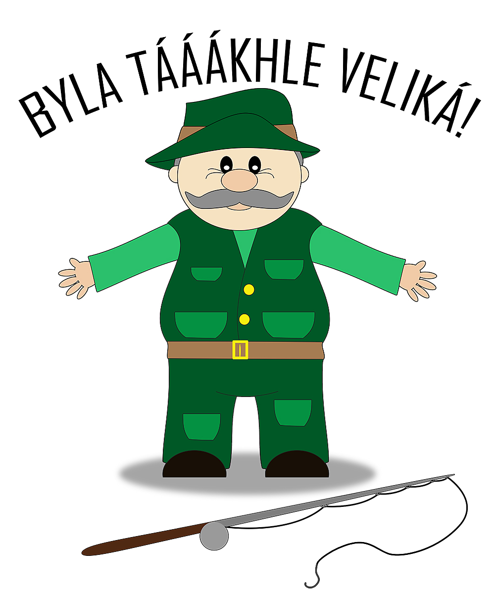Triko s maskáčovými rukávy s ilustrací rybáře s knírem v zeleném rybářském oblečení a klobouku ukazujícím velikost svého úlovku. Rybářský prut u rybářových nohou. Nápis: Byla tááákhle veliká.